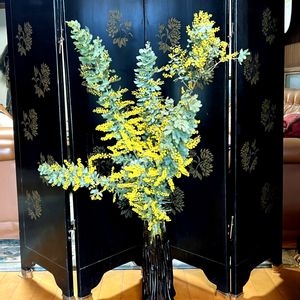 銀葉アカシア ミモザの花を、玄関の生け花に‼️ 自然の枝をそのまま投げ入れのようにしました🌼 ご近所さんから沢山いただき、リースやスワッグも‼️