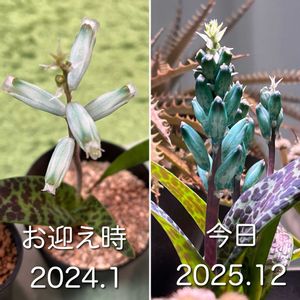 寒い、寒いですねー😨 雪がたくさん降ってる地域もあると思いますが、大丈夫ですか? 普段 こちらもほとんどマイナス気温になることがないのに、この1週間 最高気温が5度前後、最低気温がマイナス2度前後🥺予報。 数日前、多肉ちゃんに水やりするか迷いました。 水やりせず枯れてしまうか、水やりして 凍ってしまうか😓 (一般的に、凍っても戻るコもいるし、ダメになるコもいる) 途中までは水やりしてましたが、途中でやめました。 なんとか玄関に取り込んだコもいるし、そのままのコも・・・😨 花たちも、大半は庭で不織布💦 どうなるかなぁ🥺 みんな、がんばれー🏁 今日の写真📷は、4年めのラケナリア ヴィリディフローラちゃん。 ヒスイ色のきれいな花です。 今年は、なんだかかわいそうな姿になってしまいましたが、たくさんきれいな花を咲かせてくれました🩵 もうちょっと前に投稿した方が色がきれいだったかな😓 みどりのまとめ あります🙋♀️