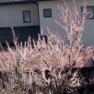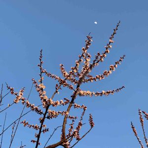 こんにちは😃 昨日夕方の我が家の杏 5分咲き。 ふと見ると月もいました🥰 今日は20度近くまで上がっているのでさらに先進みました😊