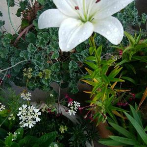 今日のお花💐 スカシユリ🌼 庭の鉢植えのホワイトカラーのユリとレースフラワー💟💟💟 二つ並んでよけいに清楚で清々しい気分🎶🎶🎶20206030📱📷