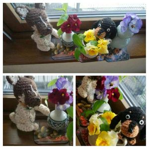 ワンワン祭りに初参加します😊 庭のパンジーやクリスマスローズが満開です😊 愛犬リンと仲良しだったミニチァダックスのハッピーの編みぐるみです🐶🐹 ハッピーのママさんが作ってくれたのでいつも添い寝しています😆よく似ています😊🐶💕🎶🎶