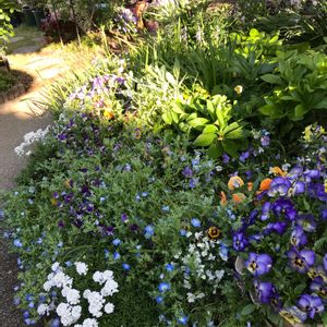 地植え組 ①ネモフィラ 種蒔きからの開花なので、徒長は許す🩵💙🤍 ②花ろまん すみれ 恋もも 大人可愛い色形に惚れました💗 ③バンジーシエルブリエ 処分品を救済したら、イエロー系の花が開花しました💛 ④多分ビオラF1 ⑤ビオラ一粒の涙 色変わりするので、🤍🩵💙アプローチは、華やかになります♪