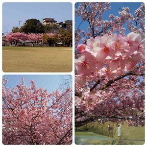 河津桜 チガママさんからの情報で 長年待望の🌸お花見が出来ました 明日からは雨の予報 散り始めた桜もあり今日が最後の見頃 ボール遊びに興じる子供の歓声 養護ホームのスタッフに♿️を押してもらって散策する高齢者 📷️🤳をお花🌸に向け 盛んにシャッターを押す老若男女 連れてきた老犬🐩は膝から降りず眠たげ ここは 長閑で平和を感じさせます
