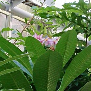 🌿"プルメリア"🌿 和名 インドソケイ キョウキクトウ科インドソケイ属の落葉樹 上から撮りたいのに背が高く蕾がちゃんと見えないね😅お花はいつ頃咲くんでしょうね""⚪🌿