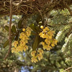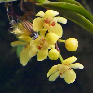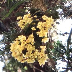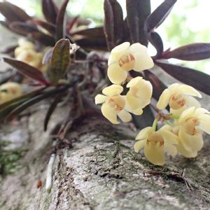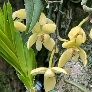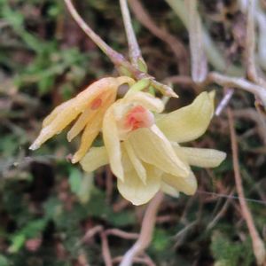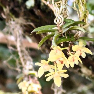カヤラン ラン科カヤラン属 多年草 小さな着生植物 日本固有種 本州(東北地方以西)から九州まで分布 樹木の幹や枝から垂れ下がるように生育し、気根で付着する。 花は丸っこくて黄色で、唇弁には赤い縞模様がある。残りの5弁花はほぼ同型、先端はやや抱えるように曲がっている。 花期4〜5月 初めましてのお花です。何の木かは分かりませんが、その木から垂れ下がっていました。