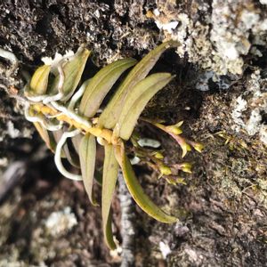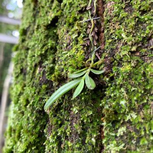 昨年見つけたカヤランです。 コメ粒大の可憐なランです。 なかなか成長しないようです。 杉の木に着生するようです。 水やりは必要なく、空気中の湿気だけで生きてるようです。