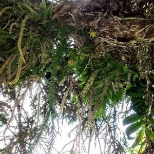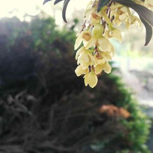 おはようございます😃 我が庭の金木犀に着生する 『カヤラン』が開花しました * * カヤランは、ラン科カヤラン属の多年草で、小柄な着生植物である。樹木の幹や枝から垂れ下がるように生育し、気根で付着する。名前の由来は、細長い葉が並んでいる様子がカヤに似るためと言われる。Wikipedia