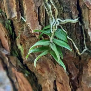 裏庭の松についているカヤランがかいかしました。数ミリの花、とても可愛いです。