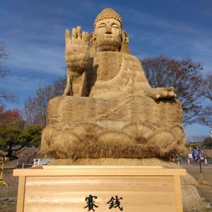 入院している父の見舞いついでに、福岡県筑前町のワラで出来た大仏さまを見て来ました😊 高さ8.5㍍位あるらしい…今年もでっかい😆 手前の賽銭箱も高さ1㍍位あります😅 小銭入れたけど横の看板に、募金箱で、来年の制作費に使いますって書いてありました~🤣🤣