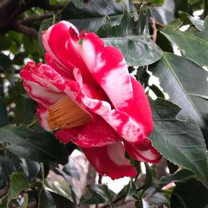 この椿の葉は❓ とても虫に、❗️ それでも咲いてくれました🌿🌿💕 有難うさん💚❤️