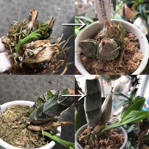 去年は世界らん展からたけのこさんを沢山増やしてしまいました😊が、なんと全く動きがありません😭 まだ株が小さく開花株ではないのか、育て方が悪いからなのか😞 下は小さくなんとなく元気がないので、らん菌が育つというペレポストに植えてみました。 カタセタムくんさんすみません、こんな感じです💦