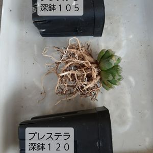 お肉園品質 グリーンジェムの植え替え過程② プレステラ深鉢105がパンパンになってて、抜いてみて案の定根鉢ww 綺麗に土を取ったものの、脱獄の技術では元の鉢には戻せず、結果鉢増し(^o^;)