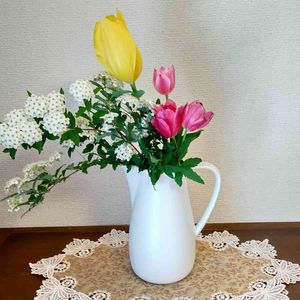こんにちは😊☀️🌷🌱 今日の午前はチューリップを片付けました。陽射しが暑かった 〜😅💦💦 このpicのチューリップがかろうじてなんとか切り花にできたので庭に咲いたコデマリと共に花瓶にいけました🤣 庭仕事もやりたいのですが…庭に日陰があまりないので夕方にやろうかな☀️陽射しがしっかりあるので。明日はまた雨らしいですね☔今日は図書館に本を返却しに行きがてらいつもの喫茶店のランチに行ってきます🍽️👋