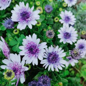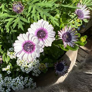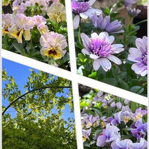 オステオスペルマム3Dシルバーの寄せ植えです😊 優しい色のフレンチラベンダーとディアスシアを合わせました。左側のペチュニアは花が写ってませんが😅おしゃれ色のカプチーノです。 葉物は前方のラミウムと右にコデマリピンクアイス。 私にしては全体的に優しいトーンで仕上がったなぁと思っています😊