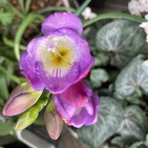 球根から育てたフリージアから花が🌸 他の花たちもモリモリです🌼