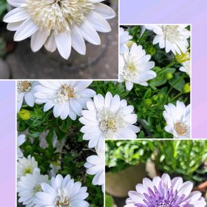 オステオスペルマム 3D 白いのと藤色の。 白いのは大株で 花付き良いけど 真ん中しべが定まらない感じ😆 本来は左上のような感じです。 藤色のは一度消えかかったけど 何とか挿芽で命繋がった感じよ🤩