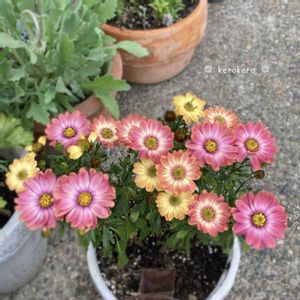 オステオスペルマム ①②ブルーアイビューティー ③④ロココ ⑤3Dピンクバイカラー 夏越し冬越ししてくれたオステオさんたちは 咲いてないのもあるけどみんな徒長しています でもかわいい~🥰 ⑤は先日かわいくてお迎えしました