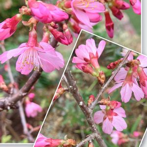 庭のおかめ桜が咲きました🌸 寒緋桜とマメサクラの交配種で早めに咲く小ぶりな桜です🌸 俯いて開ききらない濃いめピンクのお花が特徴です♬ ②枚目は白くなってビックリしたけどスッカリ濃いピンクに戻ったラブポーション🌸 紫の3Dと共に夜も外で大丈夫になりました👌 昨日は午後からみぞれ… 今日は夜に雪が積もるかも予報❄️ 明日まで寒いらしいから明後日から春になるかな♬