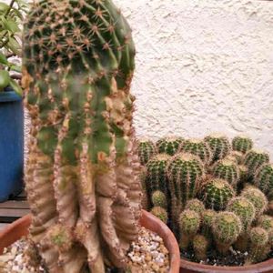 子沢山サボさん🌵。後ろは全部、子供たちです。とってもご長寿なのに、また赤ちゃんが。 最近、てっぺんの形が・・・綴化してきてるかも?