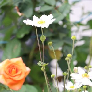 シュウメイギク🤍さん とミニバラ🧡さん 凛と清々しいシュウメイギクさんと オレンジ🧡色がキュンキュンなミニバラさんです💕 お隣のお庭を撮らせて貰いました✨ 雨が今にも落ちて来そうな空模様です 予報ではこれからお天気回復すると言ってますが どうかしらねぇ➰🤗 ーお隣のお庭よりー