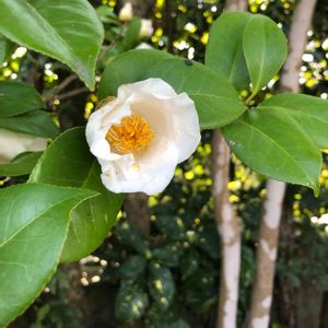 おはようございます😃 美しい椿です。 小さな畑の隅に夏蜜柑と椿の木が植えられています。 夏蜜柑がイタズラされないようにネットが張られていました。 周りを一回りして、驚きました。❗️ 横に白椿が一緒に咲いています。 こんな紅白の花を付ける椿は初めてです。 根元を覗いて、分かりました。 くっつくように2本の木が植えられています。 白花はまだ咲き始めのようです。 どちらもとてもいい花です。 赤花は一重、中輪から大輪に近い大きさで、太い立派な筒シベです。 紅妙蓮寺だと思います。 白花は去年、ここで、加賀八朔という美しい白椿を見ました。 中部地区にも似た白八朔という花が古くからあるそうです。 それかもしれません。 夏蜜柑と一緒に美しい紅白の椿。 いい椿に出会いました。😘