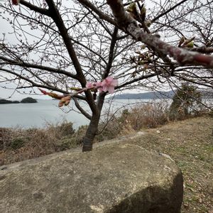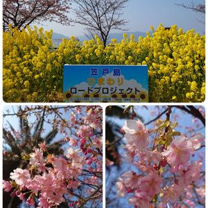 下松市の笠戸島の河津桜が咲き始めました。見頃はまだ先のよう。 花壇の菜の花はちょうど見頃でした。 癒し課のレモンさんはまだまだドライブが苦手😅