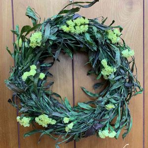 ドドナエアとスターチスのリース。 やっと完成しました。1週間くらい前に茂り過ぎたドドナエアを剪定していたら、リースができそう💡と思いついたまでは良かったけど、合わせる花にずっと迷ってました。ドドナエアだけだと少し寂しい。あれこれ試行錯誤して、スターチスの黄色💛だと少し春めいた感じになるし、そのままドライになるので、決定🎶