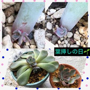 こんにちは(*^▽^)ノ💐🎶 🏷毎月13日と14日は葉挿しの日🎶参加させてくださいm(*_ _)m ♡o。+..:*♡o。+..:*♡o。+..:*♡o。+..:*♡o。+..:* こちらは昨年mintoちゃんから戴いた…白雪姫ちゃん…😍 ドキドキしながらの😬思い切ってチョンパ✂️して…😶💦 葉挿しもチャレンジ😋🎶🌱 親株には子株ちゃんも2つ🌱🌱 順調です🥳🙌🎶 なので🏷ごっつごきげん🎶も付けさせてもらいました😋