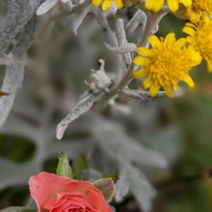 おはようございます☁☀ シロタエギクのお花さんが咲きだしました バラは ミニバラ インスパイア 🏷金曜の蕾たち 🏷金曜ローズショー 🏷ウクライナ🇺🇦に平和🕊🕊を