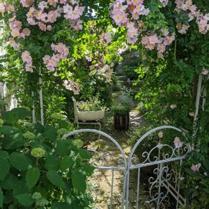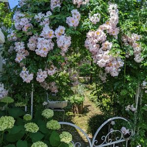おはようございます☀ ワタシの大好きな エバンジェリンが 咲きだしました 朝から ミツバチ🐝さんが せっせと 働いて エバンジェリンは今は4本に お庭の入り口のアーチ 手作りのお隣さんとの木製フェンス 後は裏庭に 急に暑くなちゃいましたね 体調を崩さないように 後 GSのTOP画面に採用されちゃったみたいで たくさんの方から お祝いのコメントや新しい花友さんからのフォロー いいねの数々 本当にありがとうございます これからもよろしくお願いします🙇♀️🙇♂️ 🏷ウクライナ🇺🇦に平和🕊🕊を
