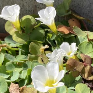 珍しい、白いカタバミが咲いていました。 花の中心は黄色です。花びらはプロペラのように重なっています。葉は、カタバミ特有の3つに分かれています。 フヨウカタバミ別名オキザリス.プルプレア、オキザリス.パリアピリス カタバミ科カタバミ属の多年草 他所のマンション前にで。