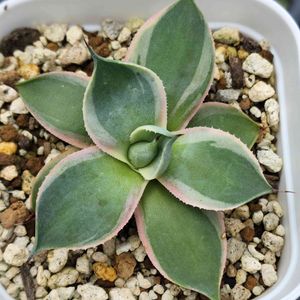 今日の一鉢 『青雷神覆輪斑』 アガベのお子ちゃんが ちょっと頬をピンクに染めていました😆 可愛いね😍