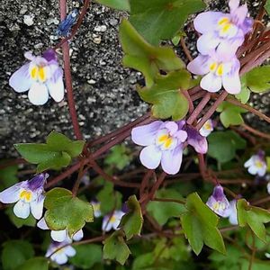 ツタバウンラン (蔦葉海蘭) 地中海沿岸・西アジア原産の帰化植物です。園芸植物として大正時代の初めに渡来しました。 細い茎が地を這い、地面に接する節から根を出して広がります。長い柄の先に浅く5~9裂した掌状の葉を付け、葉腋から長い花柄を出して小さな唇形花を付けます。 花色は他に青桃色や白色があり、花後は5㎜くらいの球形の果実が下垂します。