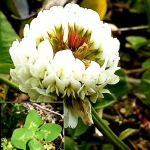 シロツメクサ (白詰草) ヨーロッパ原産の帰化植物です。明治時代に牧草として渡来しました。 花はマメ科特有の蝶形花が集まってボール状になって咲きます。 江戸時代にオランダからガラス器を輸入した時に、この植物がパッキン(緩衝材)として詰められていた事と、花の色からこの名前が付けられました。 本来は三葉ですが、稀に四葉で見つかる事もあり「四葉のクローバー」と呼んで、幸福のシンボルにされています。 たまたま見つけました\(^o^)/✌︎( ¨̮ )✌︎ 皆様に、幸あれ~~❗(*ᵕᴗᵕ)ウンウン