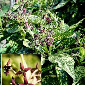 アオキ (青木) 班入り葉の園芸品種です。庭木としても、自然界でも普通に見られます。雌雄異株で、これは花序が長いので雄株かな? 綺麗な赤い実を付ける事は知っていても、花を見る機会は少ないかもしれません。 また、黄色い実を付けるものがあったり、班入り葉は実が付きにくいとも言われます。