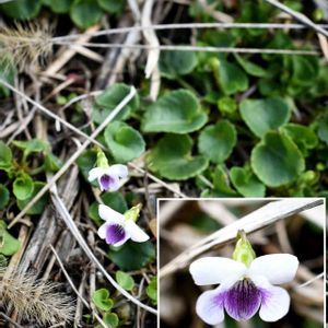ツボスミレ (壺菫) タチツボスミレと同じ、有茎種のスミレになります。🏠の裏の休耕田に群生していました。壺とは庭の事ですが、庭ではほとんど見かけません。 花径1㎝ほど、距は丸く短い。葉は心臓形で縁に浅い鋸歯が有ります。 花色は白で、唇弁に紫色の線が目立ちます。これ☝️は何故か、紫色が強く出ています。 別名:ニョイスミレ (如意菫) 。この如意とは、僧侶が持つ仏具の一種で、葉の形が似ている事に由来します。