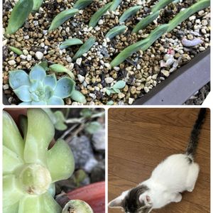 こんにちは〜( ´ ▽ ` )ノ バラバラ事件発生(>人<;)💦 ↙️根っこが溶けていた状態で!カット✂️✂️黒い点が無くなるとこまで、切り進み💦 ⬆️元気な葉っぱを葉挿しへ!チャレンジ٩(^‿^)۶ ドキドキ〜💦💦 あっ!名前は、分かりません(・・?) ↘️保護猫ちゃん迎えました😻 小太郎!しっかり、お父さんしています✨✨ まおまお!2ヶ月の頭で💦 🏷️どたま祭り参加します✨ 今日も健やかにお過ごしください🍉