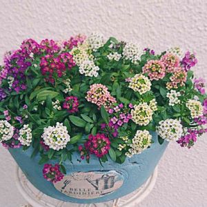 名付けてアリッサムドーム✨ 毎年の楽しみ😊 多色×3ポット購入 鉢は石焼きご飯を想像する『お釜鉢』黒が褪せたので→ブルーに塗り替え🖌️はみ出た(雜っ)
