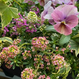 スィートアリッサムとパンジーのツーショット❣️寄植えの一部です😊 ピークが過ぎようとしているので写真撮っておかないとね、綺麗なうちに‼️ ミックスのアリッサムが好きだなぁ💕💕