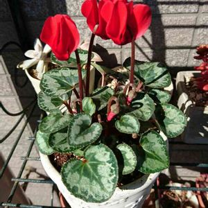 三鉢200円の最後のひとつはまたまたガーデンシクラメンでした😆 真っ赤で、葉っぱにたくさんシルバーが入ってオシャレな子です。ちょっとヒョロっとしてるけど、まだまだたくさんお花を咲かせてほしいです💗 二年目組の子達は植え替えてから調子が悪く、なかなか花芽が大きくなりません。何が悪かったのかわからず苦戦しています💦💦