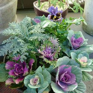 少し変わった葉牡丹が安くなっていたので2つ加えて、シルバーレースとフリルパンジーも一緒にぎゅうぎゅう寄せました❗ 真ん中のプラチナケールが根っこもしっかりしていたので大きくなってくれることを期待して真ん中にしたけど、今は埋もれてます💦💦