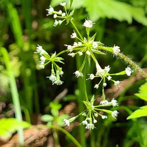 ヤブニンジン セリ科ヤブニンジン属 小花序の周りに5本の両性花が見えています。右端の花が判り易いです。茎や花柄には長い軟毛があるのも特徴。