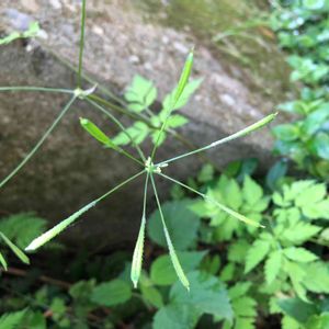 山の麓の田畑散歩🎶 これはヤブニンジンです😊 変わった感じの花序でしょう。真ん中にかたまってるのが雄花で、その周りを5個の両性花が取り囲んでます。 両性花の下の子房は棍棒状で先に向かった太くなり、そのままの形で長くなって果実になります。