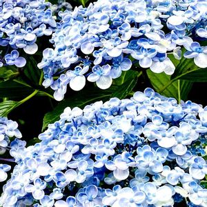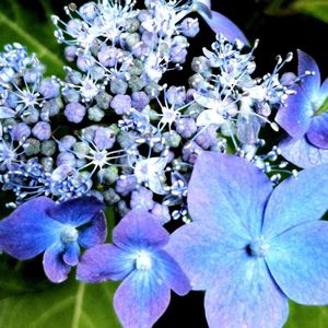 🏷水曜日は水色 ガクアジサイに超接近🔎 あ…雨粒が落ちてきました… ⋰⋰ ☂ (ृ ˘ ꒳ ˘ ृ )ु ⋱⋱