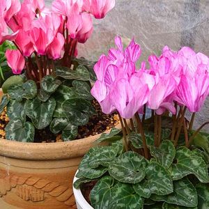 11月にハクサンのキャンペーンで届いたシクラメンクレヨン💠 手前はヤシの実チップで植えて室内管理。 奥は土で植えてベランダ管理です。 どちらも順調です🙆