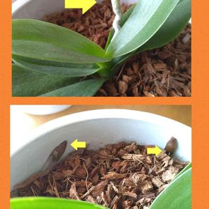 去年の6月 還暦祝いに届いた白い胡蝶蘭✨ 花が終わった後少しずつ元気が無くなり...😢 鉢から出してみると 大きな鉢の底に沢山の発泡スチロール。 その上に黒いポットが3つ それぞれに胡蝶蘭をひとつずつ植えて水苔を乗せてある状態。 水苔が乾いたら水やりしていたのですが 黒ポットの中でふたつの株🌱は根腐れ😭 最後のひとつも根っこは腐れて株元だけがかすかに白い根が出てくるかも?な状態でした。 ダメ元でこのひとつを植え替え。 水苔は止めてベラボンプレミアム(ヤシの実チップ)を使いました。 小さな葉っぱが6枚になり 茎のようなものが出てきました🙌 復活の兆し🥰