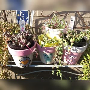こんにちは😄 風もなく気温も上がって気持ちよい日になってきましたね。 🏷ネックレスの日 🏷毎月8日は鉢の日に参加します。 ネックレスは、左からグリーンネックレス、ルビーネックレス、ピーチネックレス、エンジェルティアーズ錦、アーモンドネックレスです。 リメ鉢3つまつぴよさんちからお迎えしました。カラスさん、カエル🐸さん、ウサギ🐰さんが描かれてます。孫たちに狙われそう😅見つけられないようにしなくては。可愛いいのでまだ仮インで土入れていません。 すみません🙇 カラスではなく、ハシビロコウでした。