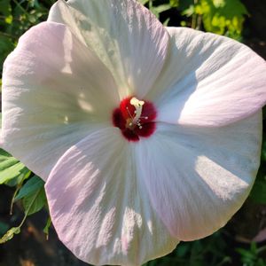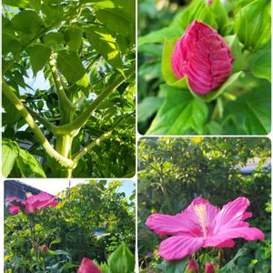 ( *ˊᗜˋ)ノꕤ*.゚おはよ︎︎𓂃⟡.· 朝の元気な花達( ͡ ͜ ͡ )...♪*゚ ①タイタンビカス大きな花姿 ②またかじられて穴が~😅 ③モミジアオイ❤️𓈒𓏸 ④モミジアオイ🤍⋆꙳ ⑤朝の癒しパワーアサガオ ブルーの種まきアサガオも咲き出しました💙🍃 熱中症気をつけて… 今月もまだまだ暑い毎日になりそう元気でお過ごしください