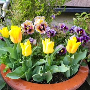 おはようございます😊 チューリップ🌷とパンシー 朝はつぼんでいる黄色💛の ミニチューリップ昨日は全開でしたꉂ🤣𐤔 🏷春色チュ!チューリップ♡ 可愛い〜お気に入りの水仙🥰 八重咲きチューリップ🌷 まだ開花待ち 大輪の華やかなキンセンカ 🌼*・🌼*・🌼*・🌼*・🌼*・ アフリカキンセンカも元気 元気パワーお届け 🏷日曜ビタミンカラー♪ 🏷元気パワー届け✨