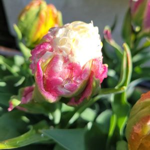 おはようございます😊 晴れて来ました🌞🌱 青空︎ ︎︎︎︎︎‐`💙☁️ ´‐𓂃 𓈒𓏸 今日は3枚目すみません🙏🏻 あまりに可愛いので🤳 雨粒✨の🌷達 ぷくぷくつぼみが可愛い 🏷雨粒♪ 八重咲きチューリップ🌷 咲いたらどんなんだろ 初めましてのチューリップ🌷 🏷春色チュ!チューリップ♡